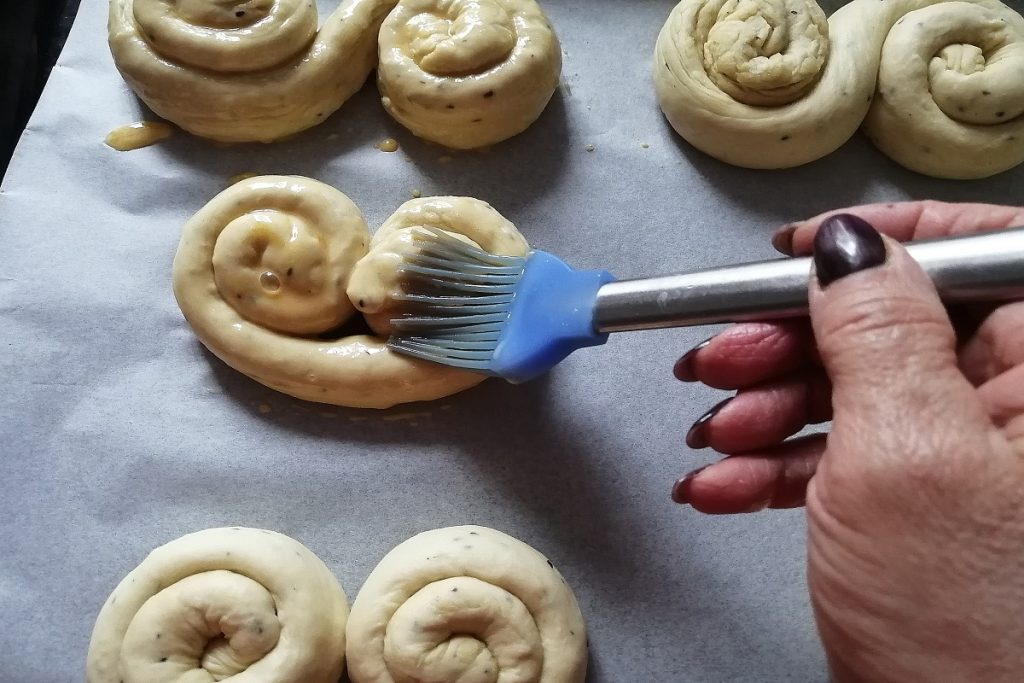 Leg de cuddure op een bakplaat met bakpapier en bestrijk ze voor het bakken met een eidooier gemengd met een beetje melk.