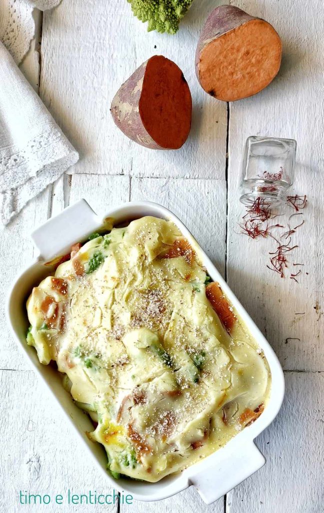 In een ovenschaal maak je een laag bechamelsaus, een van kool, bechamel, zoete aardappel en ga zo door tot het einde. Bedek met bechamel en gehakte amandelen.