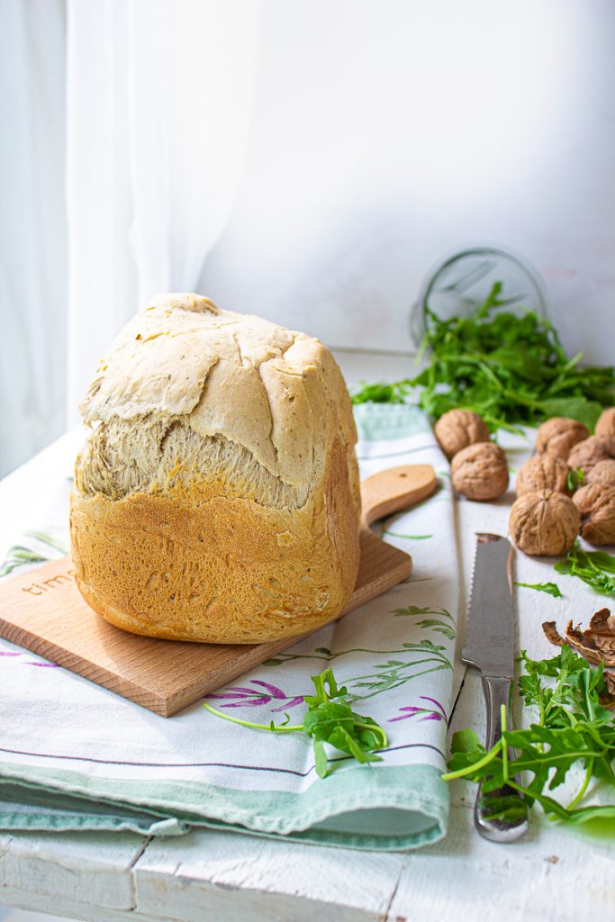 Zacht brood deze panbauletto met rucola en walnoten, heerlijk besmeerd met pindakaas, tahin of kikkererwtenhummus.