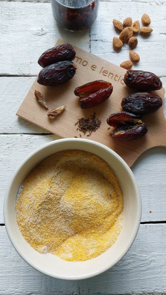 Giet in een pan het water en de plantaardige melk en breng licht aan de kook. Voeg geleidelijk de twee meelsoorten toe terwijl je met een garde roert, gedurende 10/15 minuten tot al het water is opgenomen en er een polenta ontstaat. Zet het vuur uit, voeg de olie toe en roer, voeg het bakpoeder toe en roer opnieuw, voeg de dadels, venkelzaad of kummel, fijngehakte amandelen, rozijnen, gedroogde veenbessen en de grappa waarin ze weken toe. Voeg tenslotte ook de geschilde appel in stukjes toe.