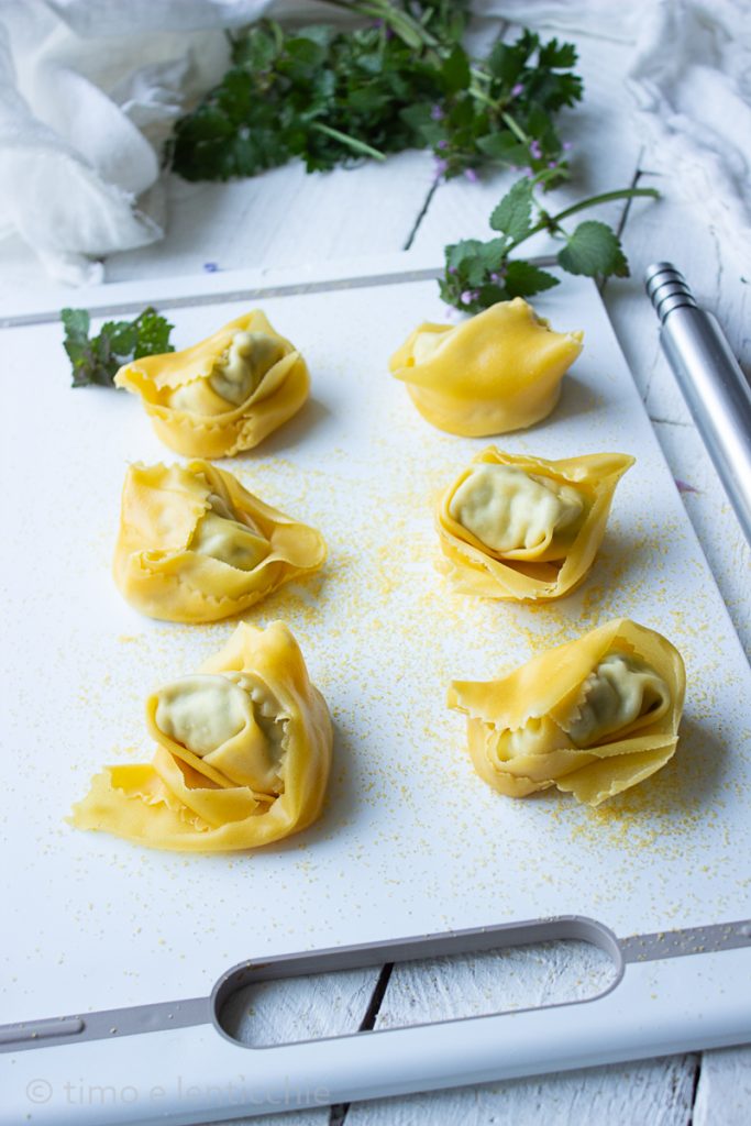Let op hoeveel vulling je gebruikt: die van mij werden aan het eind, gezien hun formaat, meer cappellacci dan tortelli. Let ook op de consistentie van het deeg: als het te dik is, kookt het moeilijk, vooral op de gestikte plekken; als het te dun is, kan het tijdens het koken gemakkelijk scheuren. Bestuif het werkblad altijd goed met bloem of semola.