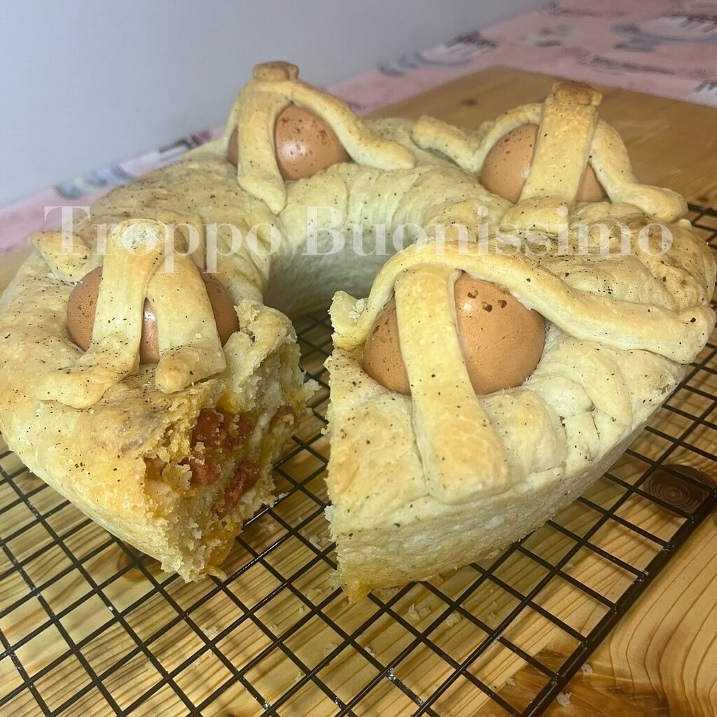 Plaats de verkregen rol in een eerder ingevette vorm met reuzel en na het zorgvuldig wassen van de eieren, droog ze en plaats ze voorzichtig in het deeg. Neem het gereserveerde stukje deeg en vorm er 8 stroken van, gebruik ze om een kruis op elk ei te maken en druk de uiteinden voorzichtig aan om ze te laten hechten. Dek af met folie en laat nog 30 minuten rijzen.