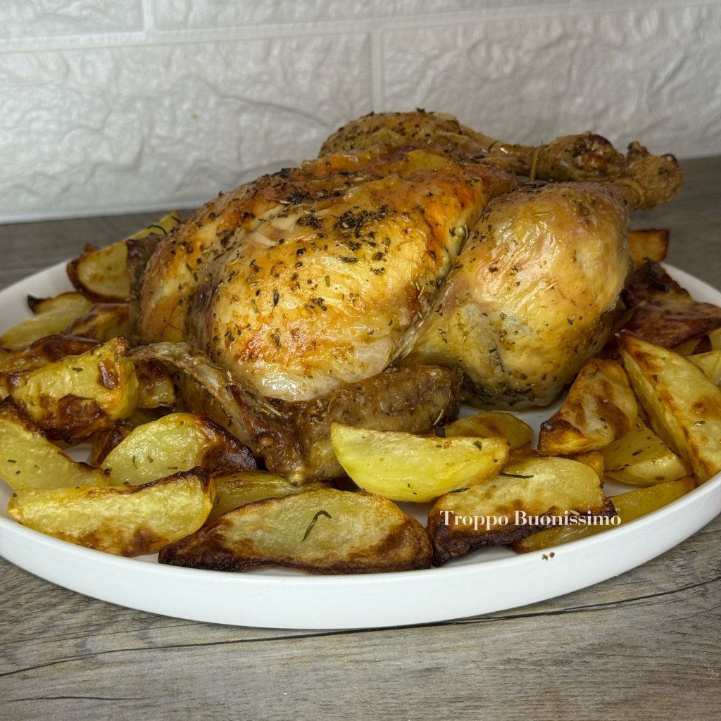 Dit jaar, voor de Pollo Arrosto Dag op 2 oktober, kon ik niets anders dan mijn speciale versie presenteren: de hele gebraden kip in de heteluchtfriteuse met knapperige aardappelen.
