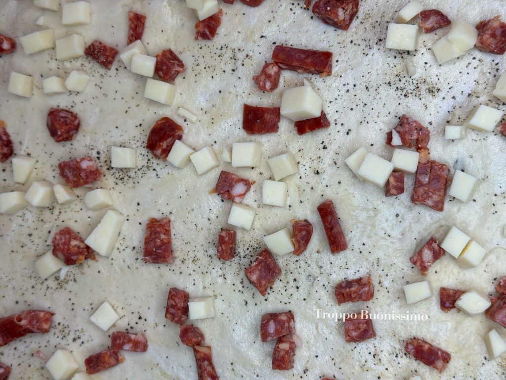 3. Verdeel er een snufje peper en de vulling van salami en provolone gelijkmatig over.