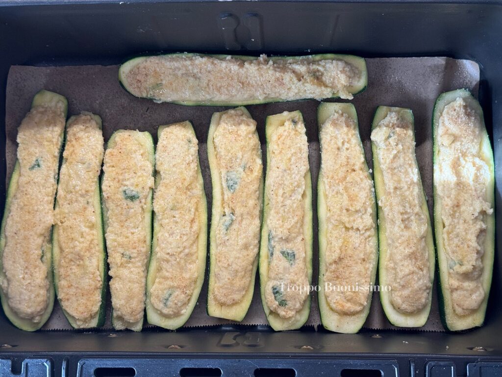 Beter zonder rooster bakken! Leg de courgettes direct in de mand van de airfryer, op geperforeerd bakpapier of op een antiaanbakmat. Het rooster is niet geschikt voor romige en delicate bereidingen zoals deze, omdat de vulling eruit kan lopen.