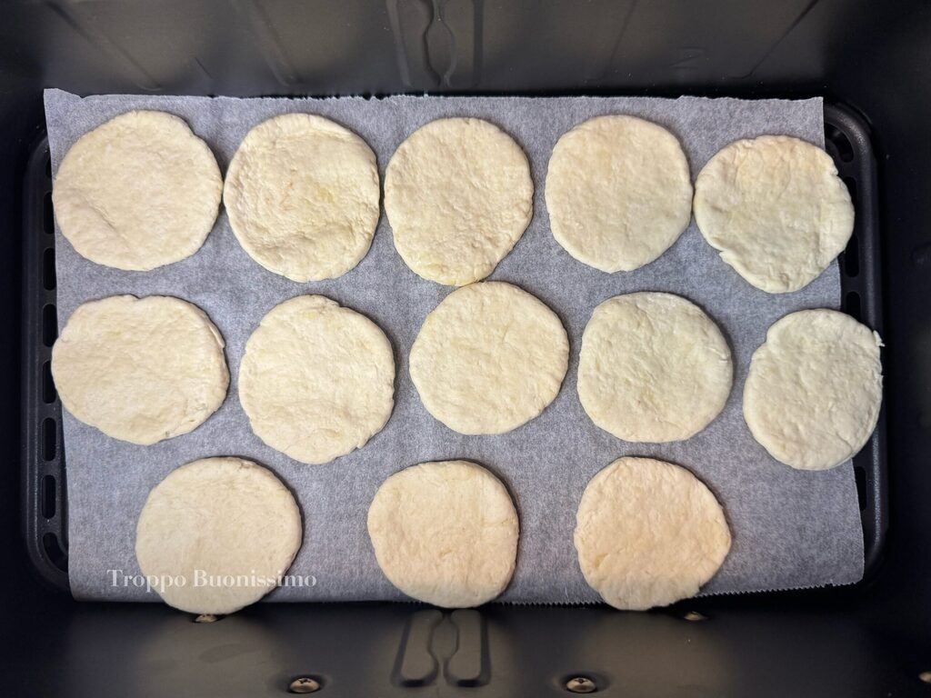 Werk elk balletje kort met de hand, rol het dan uit met een deegroller tot een dunne schijf van ongeveer 4-5 mm dik.Plaats de pizzette in de mand van de airfryer (het is beter met bakpapier).