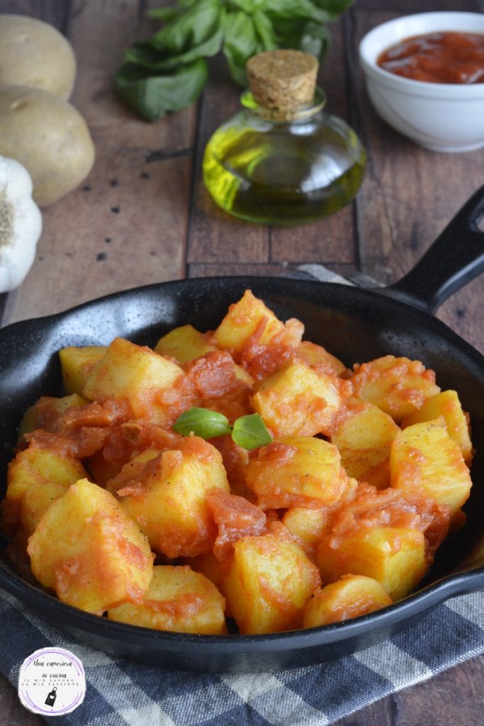 De aardappelen met tomaat in de pan zijn een eenvoudig, heerlijk en geurig gerecht. Zachte stukjes aardappelen die eerder zijn gekookt, worden in de pan gesauteerd met tomatenpulp, knoflook en basilicum. Een perfect bijgerecht om zowel vlees- als visgerechten te begeleiden. Bovendien is het zeer voordelig, bereid met de basis ingrediënten die we in de keuken vinden.