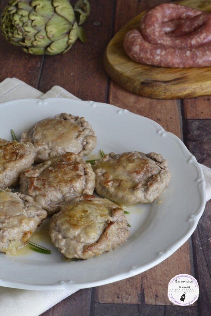 De carpaccio-rolletjes met artisjokken en worst zijn een gemakkelijk en smaakvol hoofdgerecht om te maken. Het recept is van mijn moeder. Ik herinner me dat als ze deze maakte, ze heerlijk waren, maar ze noemde ze anders, namelijk “rozetten”. In feite is de vorm niet de klassieke langwerpige van de rolletjes, afgesloten met een tandenstoker, maar ze zijn verzegeld als een rozet. Te bereiden op elk moment van het jaar, omdat ik diepvriesartisjokken heb gebruikt voor de vulling, maar als ze in het seizoen zijn, kun je kiezen voor verse. Te serveren met het bijgerecht dat je wilt, ik raad je aardappelpuree aan.