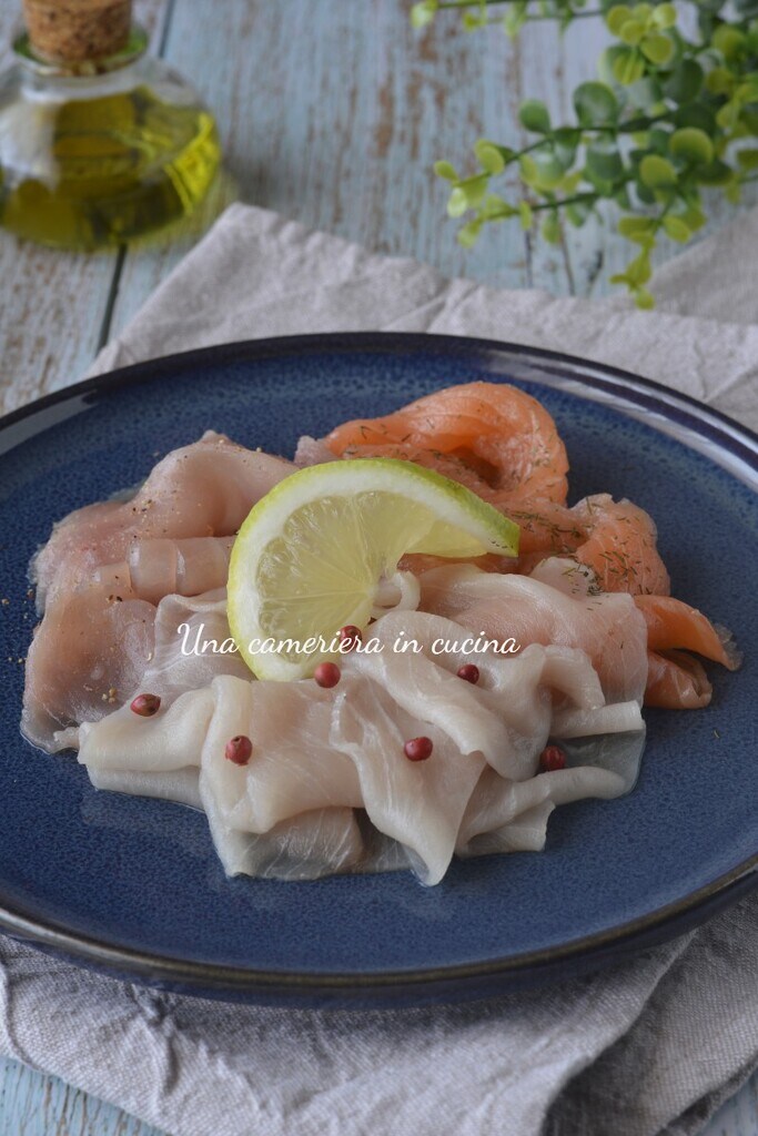 Het carpaccio van zalm, tonijn en zwaardvis is een voorgerecht van rauwe vis, supersnel en heel gemakkelijk te bereiden. Voor het recept heb ik kant-en-klare viscarpaccio (zalm, tonijn en zwaardvis) gebruikt die je bij de visafdeling kunt vinden of je kunt je vertrouwde visboer vragen om dunne plakjes voor je te snijden. Simpelweg gekruid met extra vergine olijfolie, citroensap, zout, witte peper, dille en een paar roze peperkorrels. Je kunt het ook als tweede visgerecht serveren. Ideaal om het hele jaar door van te genieten.