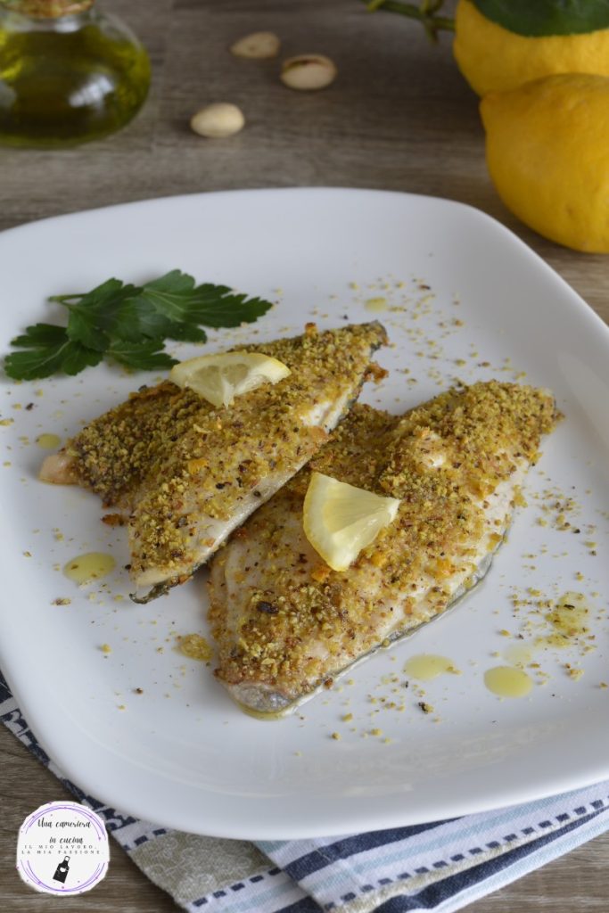 • Giet een beetje extra vergine olijfolie over elk filet, bedek ze met pistachemeel en breng ze op smaak met fijne zout, witte peper en geraspte citroenschil.