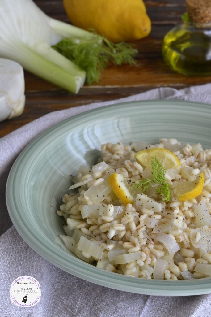 De gerst met venkel en citroen is een zeer eenvoudig en heerlijk hoofdgerecht. Een gezond, detox en smakelijk recept, bereid met slechts drie ingrediënten, zoals gerst, venkel en citroen. Te genieten op elk moment van het jaar, ook als koud gerecht tijdens het warme seizoen, eventueel met rauwe venkel in dunne plakjes gesneden.