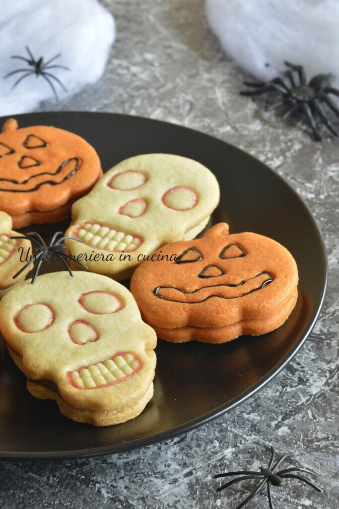 De gevulde Halloween koekjes zijn heerlijke en leuke koekjes in de vorm van pompoenen en schedels voor het Halloweenfeest. Voor het recept heb ik het klassieke zanddeeg gebruikt, waarbij ik de helft van het deeg heb gekleurd met voedingskleurstof, in dit geval door geel en rood te mengen om een mooie oranje kleur te krijgen voor de pompoen. Voor de vulling heb ik gekozen voor aardbeienjam voor de schedels en Nutella voor de pompoenen. Tot slot heb ik de details afgewerkt met kant-en-klare gelkleurstof in twee verschillende kleuren. Het zal “monsterlijk” leuk zijn om ze samen met de kinderen te maken.
