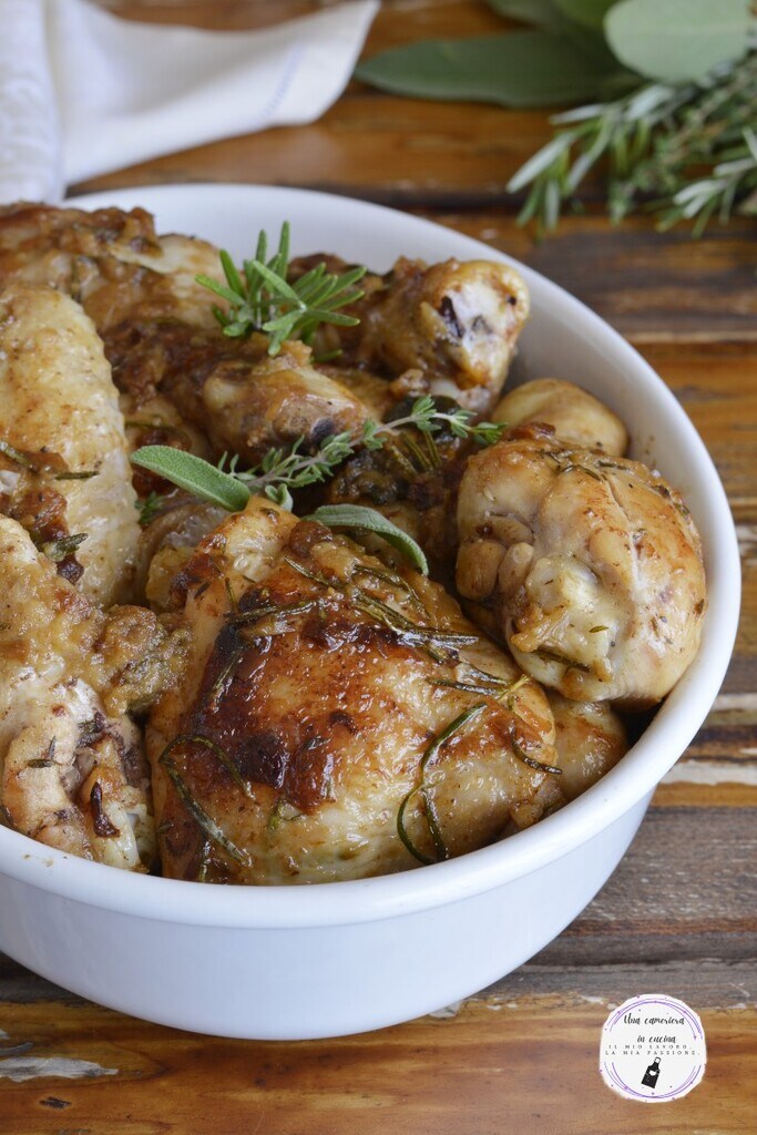 Doe de verschillende kipdelen in een kom en breng op smaak met rozemarijn, tijm, salie en nootmuskaat.