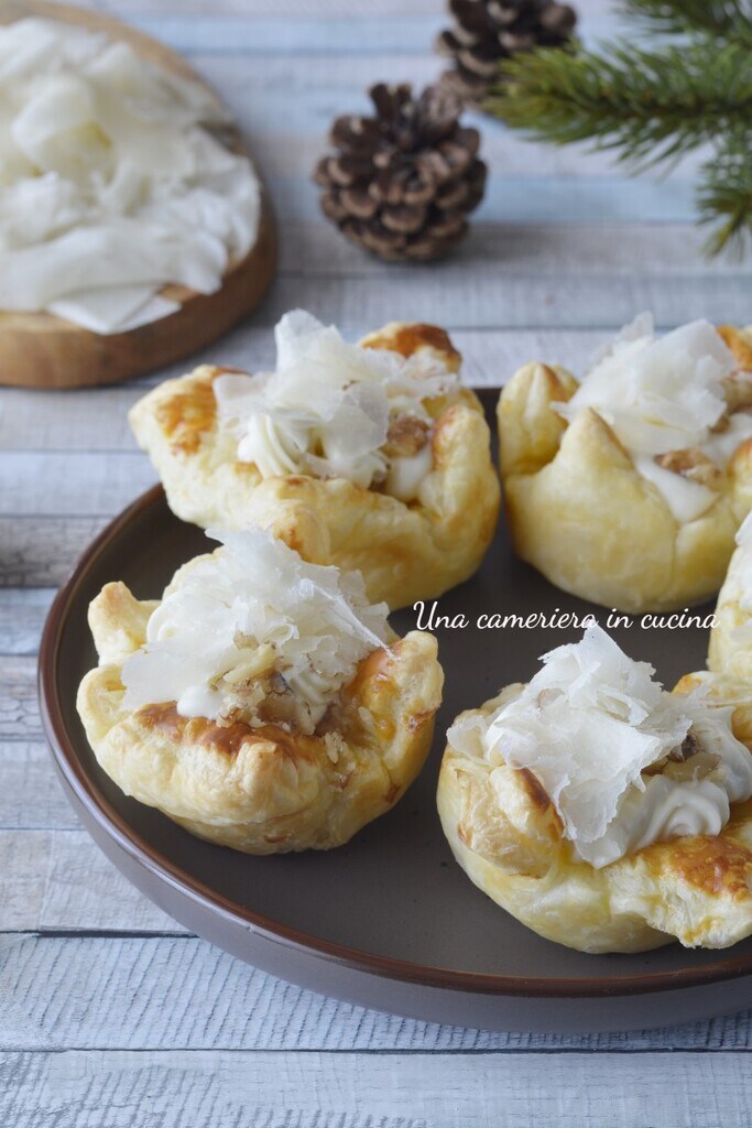 De mandjes met mascarpone gorgonzola en raspadura zijn eenvoudig en smakelijk om te bereiden. Heerlijke bladerdeegmandjes gevuld met een delicate vulling van mascarpone en gorgonzola, gegarneerd met kastanjehoning, walnoten en raspadura, een van de typische kaassoorten uit Lodi. Perfect om te serveren als aperitief of voorgerecht bij grote gelegenheden, zoals in dit geval voor de kerstfeesten.