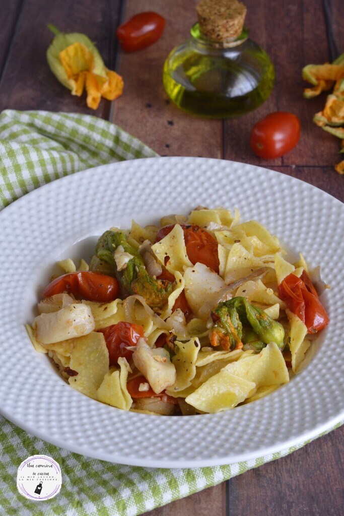 De pasta met kerstomaatjes, schorpioenvis en courgettebloemen is een heerlijk eenvoudig hoofdgerecht dat gemakkelijk te bereiden is. Het recept dat ik u voorstel, ontdekte ik tijdens mijn laatste bijeenkomst op het hoofdkantoor van Giallozafferano. De auteur van dit gerecht is Giorgione, gast van de dag gewijd aan de Blog Awards 2024. In vergelijking met zijn versie heb ik een kleine wijziging aangebracht, namelijk het type pasta. Hij gebruikte toen verse pasta zonder eieren en met volkorenmeel, terwijl ik koos voor een snellere oplossing met droge eipasta, zoals maltagliati. Laten we zeggen dat je elke pastavorm kunt gebruiken gezien de veelzijdigheid van het gerecht.