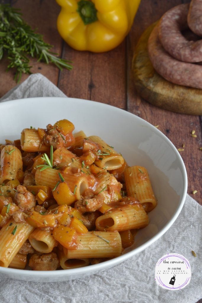 De pasta met paprika en worst is een rijk en smakelijk hoofdgerecht!!! Voor het recept heb ik rigatoni gebruikt, maar je kunt elke andere pasta gebruiken, bij voorkeur korte pasta. Voor de saus, naast paprika en worst, heb ik tomatenpuree toegevoegd voor kleur, venkelzaad, rozemarijn en chilipeper om het nog smaakvoller te maken. Ideaal om te serveren als hoofdgerecht voor elke dag of voor speciale gelegenheden. Als je de pasta nog lekkerder wilt maken, kun je een beetje kookroom toevoegen.