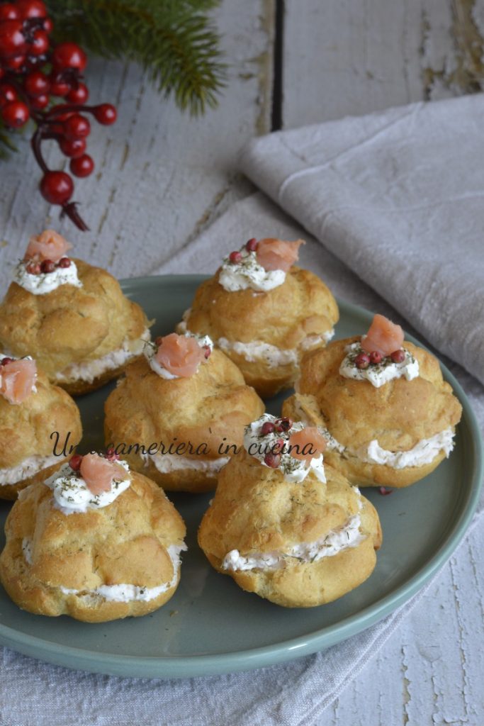 De soesjes gevuld met kaas en zalm zijn een smakelijk en zeer eenvoudig te bereiden voorgerecht. Ze zijn perfect om van te genieten tijdens de kerst, maar niet alleen… Voor het recept heb ik kant-en-klare soesjes gebruikt, zodat ze nog sneller te maken zijn. Ik heb ze gevuld met verse smeerkaas, waaraan ik gerookte zalm, dille, een kruid dat perfect samengaat met vis, en roze peper heb toegevoegd voor zowel een kleurnuance als een andere smaak dan andere soorten peper.