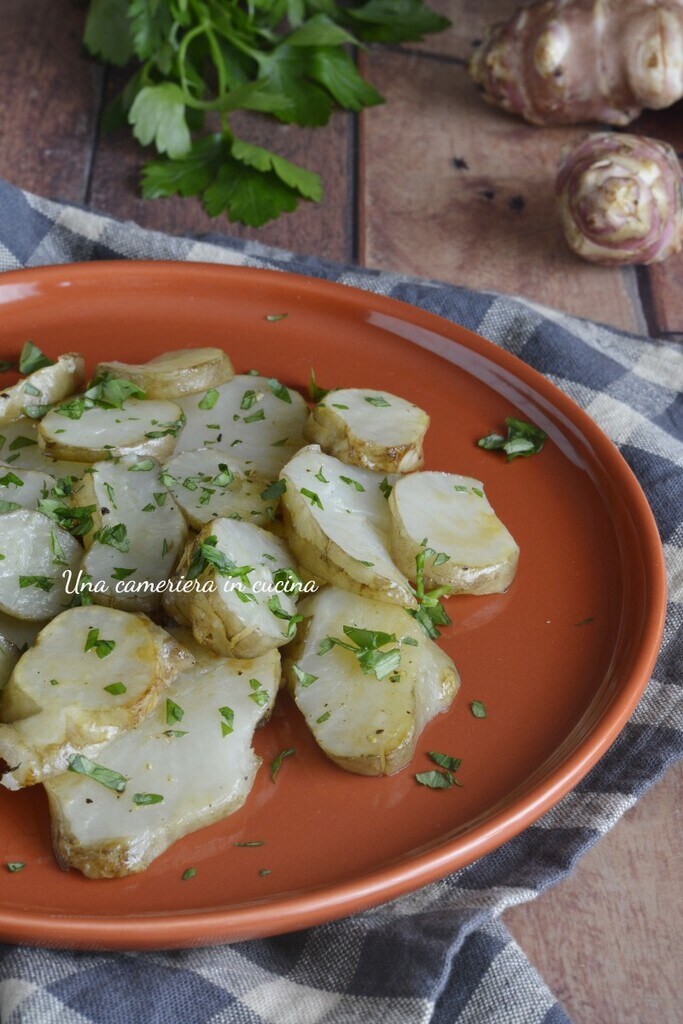 De topinamboer in de pan is een uitstekende gezonde en lichte bijgerecht, maar ze zijn ook prima als basis voor verschillende bereidingen. De topinamboer, ook wel Duitse raap, Jeruzalemse artisjok of nep truffel genoemd, is een knol net als de aardappel, maar met de eigenschappen van een groente en heeft de smaak van een artisjok. Rijk aan mineralen en vitaminen, heeft het verschillende voordelen voor het lichaam. In mijn recept heb ik het op een eenvoudige manier bereid, bijna een basisbereiding voor andere recepten. Perfect om verschillende gerechten te maken, van voorgerechten tot hoofdgerechten. Bovendien kan het zowel rauw, dun gesneden als gekookt worden geconsumeerd.