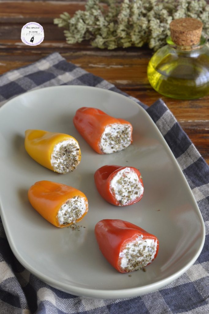 De zoete pepers met kaas en kruiden zijn perfect om te serveren als voorgerecht of bijgerecht, bovendien zijn ze gemakkelijk te bereiden. Voor het recept heb ik kleine, zoete pepers gebruikt in verschillende kleuren van rood tot geel, en ze vervolgens gevuld met verse smeerkaas gearomatiseerd met kruiden.