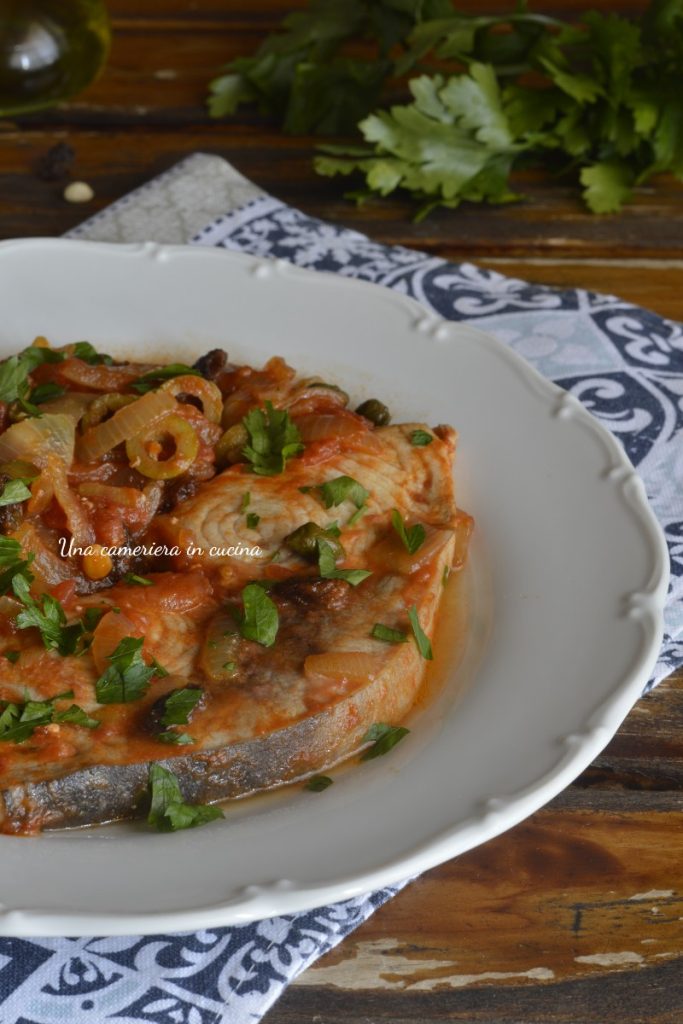 De zwaardvis alla ghiotta of u piscispata â ghiotta in het Siciliaanse dialect is een smakelijk hoofdgerecht uit de Siciliaanse traditie, typisch voor Messina, maar ook uit Calabrië, met name uit Reggio Calabria. Zachte plakken zwaardvis gekookt in de pan, geserveerd met een saus op basis van tomaat (in dit geval heb ik pulp gebruikt), groene olijven, ingelegde of gezouten kappertjes naar smaak, pijnboompitten en rozijnen (of passolina, ook bekend onder de Turkse naam smirne). Een eenvoudig en smaakvol recept, het hele jaar door te genieten, alleen of met gekookte aardappelen in een salade.
