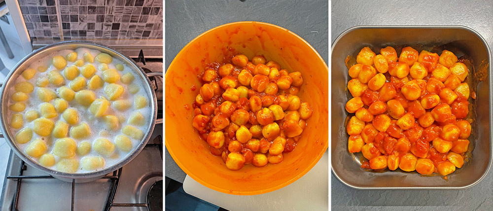 Giet de gnocchi af en doe ze in een kom met de tomatensaus. Meng ze goed en giet de helft van de gnocchi in de bakvorm.