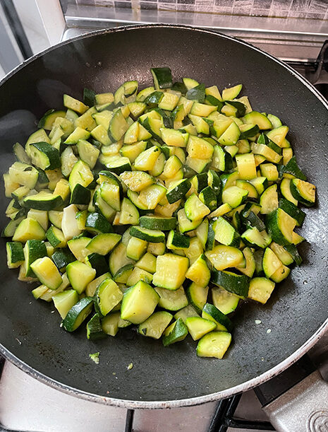 Voeg de inmiddels afgekoelde courgettes toe en meng goed.