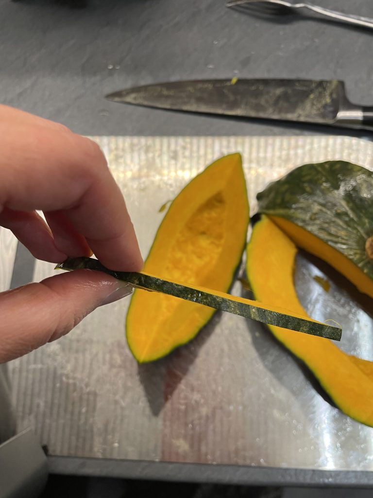 De schil van de delica pompoen, de variëteit die ik heb gebruikt, is eetbaar en rijk aan vezels, bètacaroteen, vitamines en mineralen, naast antibacteriële en antivirale eigenschappen. Bij het koken wordt het erg zacht en ik heb het laten zitten omdat ik het moeilijk vind om het te verwijderen zonder mezelf te snijden.