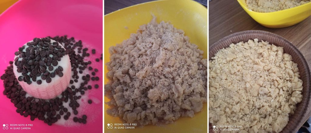 Je hoeft alleen maar een kruimeldeeg te maken, het in de bakvorm te doen, vullen en bedekken met meer kruimels. Je kunt het vullen zoals je wilt: ricotta en Nutella, jam, confituur en appels of, zoals in dit geval, met ricotta en chocoladedruppels.