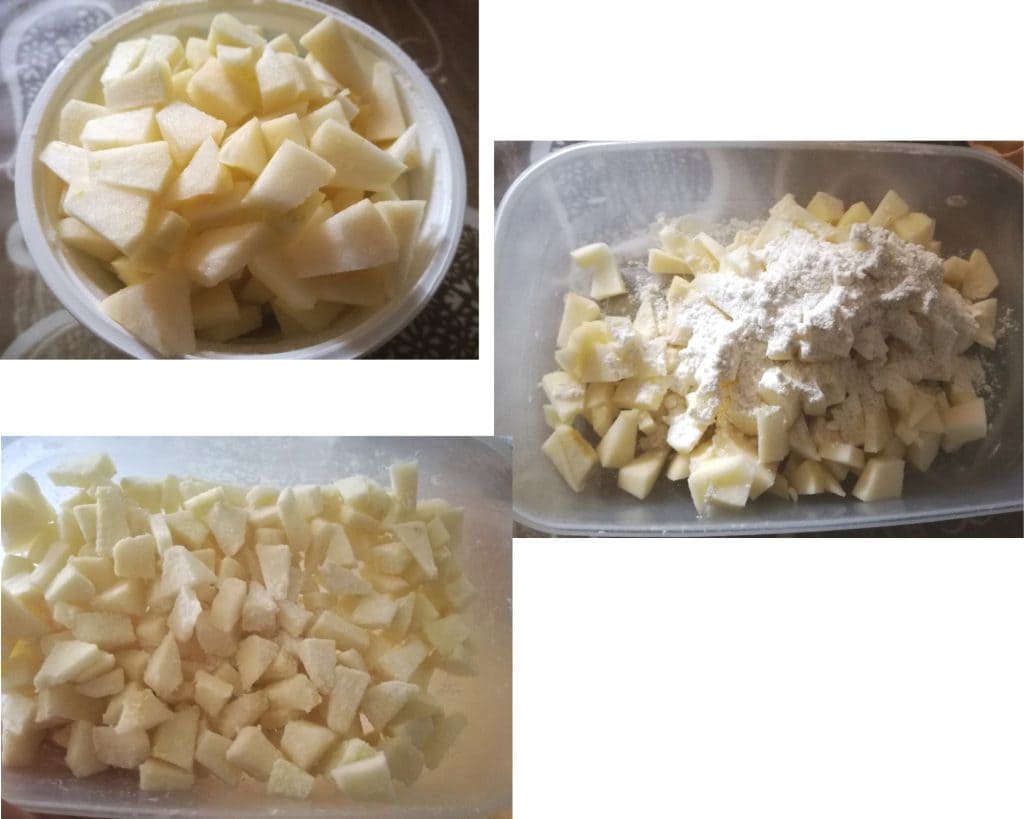 Laten we ons nu concentreren op de appels. Schil de appels en snijd ze in stukjes, laat een deel over voor de decoratie (ik gebruik bijna een hele voor decoratie en de rest in stukjes). Doe de appelstukjes in een kom en bestuif ze met een kleine eetlepel bloem, dit is een truc om te voorkomen dat alle appels tijdens het bakken naar de bodem zakken.