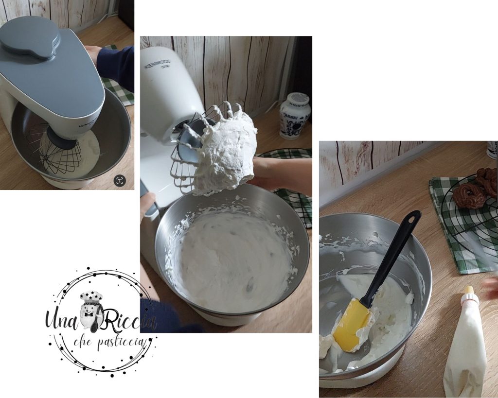 Ondertussen maken we de slagroom klaar. Giet de vloeibare room in de keukenmachine en klop het op. Als we ongezoete room gebruiken, kunnen we 50 gram poedersuiker geleidelijk toevoegen terwijl we de room kloppen.