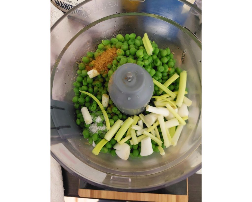 Om de flans te bereiden hebben we gekookte erwten nodig. We kunnen ingeblikte, diepvries erwten (eerst koken) of gedroogde erwten (weken en dan koken) gebruiken. Zodra de erwten gaar zijn, laten we ze goed uitlekken en doen ze in de beker van de mixer. Voeg ook twee schoongemaakte lente-uitjes, een snufje zout, een snufje peper en een theelepel kerrie toe. Start de machine en laat mengen totdat er geen stukjes erwten meer zijn.
