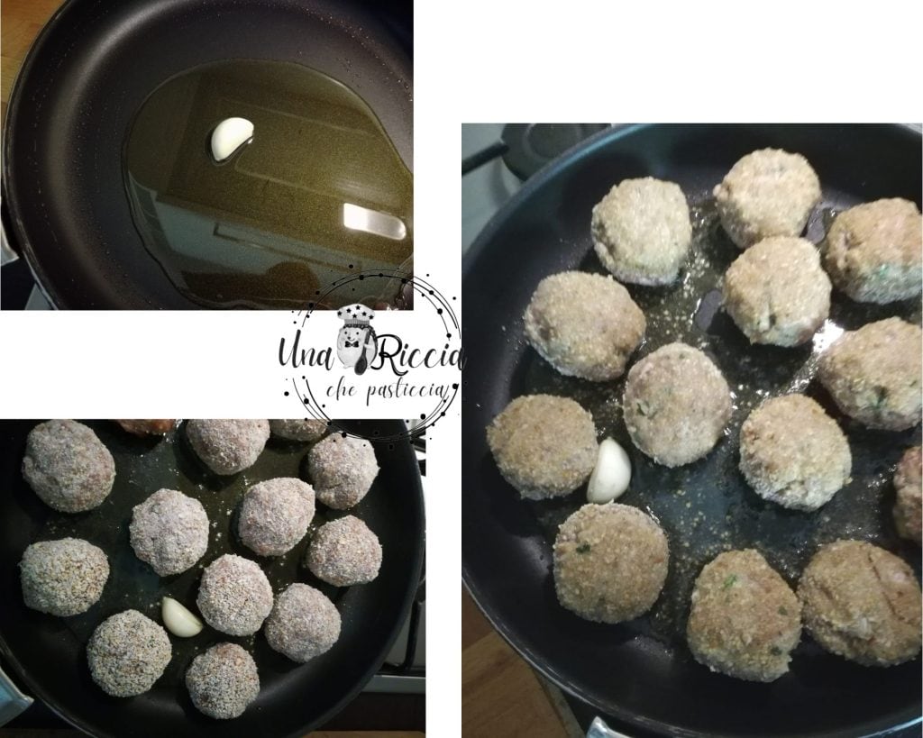 In een antiaanbakpan doen we een teentje knoflook en olijfolie, verhitten we het en voegen dan de gehaktballen toe. Laat ze aan alle kanten bakken en haal ze vervolgens uit de pan en leg ze op een bord.