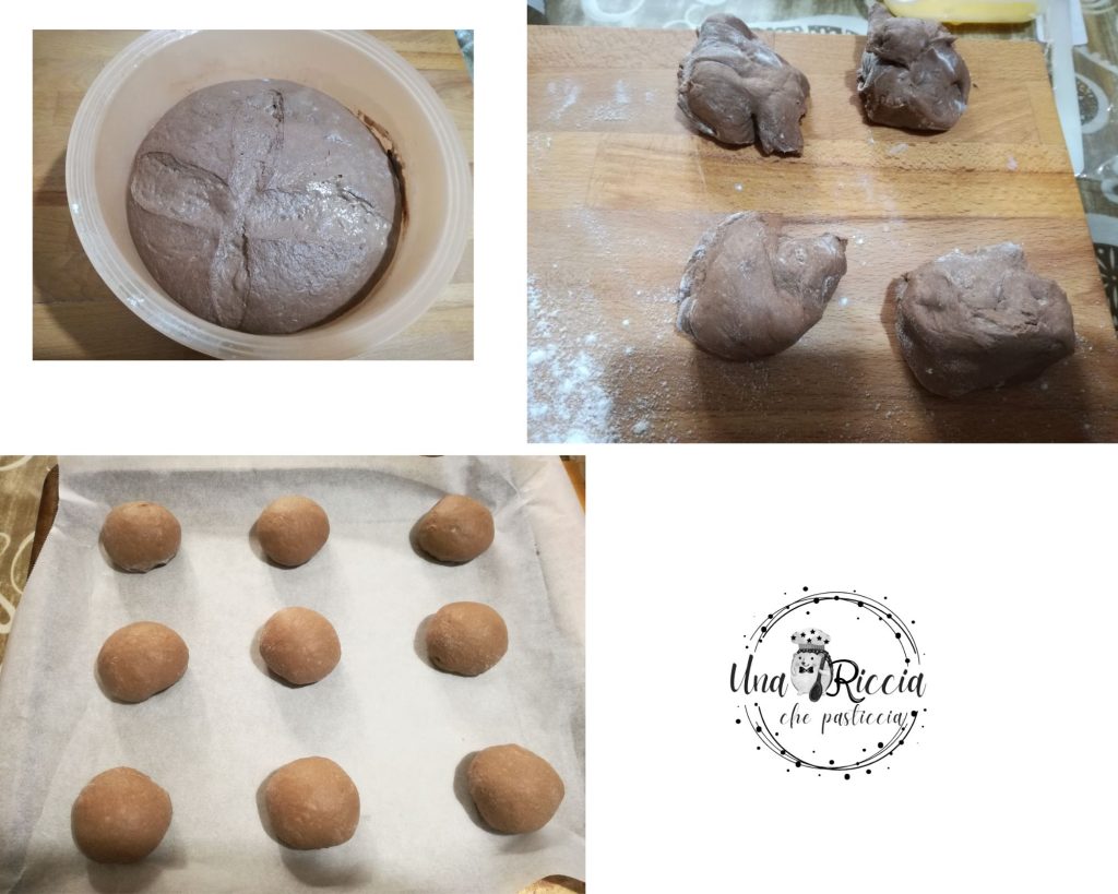 Leg het deeg op een werkblad en werk het een minuutje met de handen, vorm een bal en leg het drie uur te rijzen in een kom bedekt met huishoudfolie.Nu het deeg is gerezen, snijden we het in stukjes van ongeveer 50 gram elk en vormen we balletjes door het deegstukje onder de palm van onze hand op het werkblad te draaien en leggen ze op een bakplaat, een dienblad of hetzelfde werkblad.
