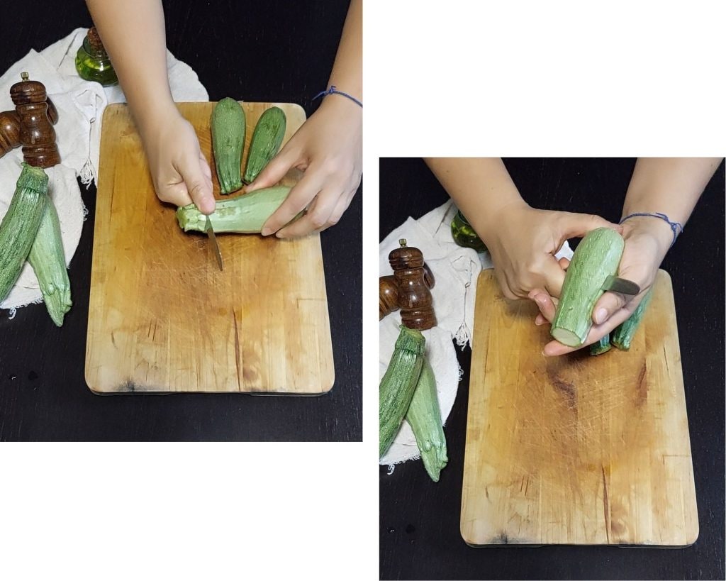 We wassen en snijden de uiteinden van de courgettes af, daarna snijden we ze in de lengte doormidden en verwijderen we het binnenste deel met behulp van een theelepel of een fruitmesje. Vergeet niet om 20/30 gram van het courgette vlees apart te houden voor de vulling.