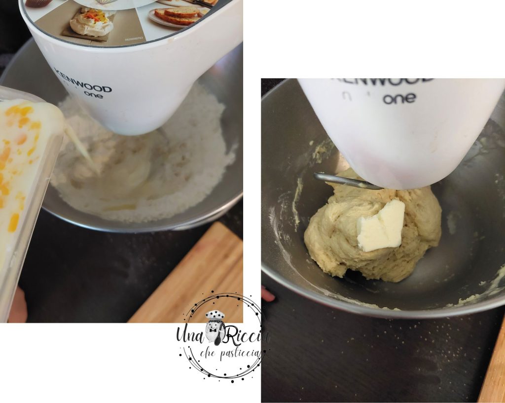 We zetten de keukenmachine aan met de deeghaak en beginnen de bloem met de gist te mengen, daarna voegen we de melk met de eieren geleidelijk toe, we kneden op middellage snelheid totdat een stevig deeg begint te vormen. Op dit punt beginnen we de zachte boter toe te voegen, een stukje tegelijk, en wachten we tot de vorige is opgenomen voordat we een nieuw stuk toevoegen.