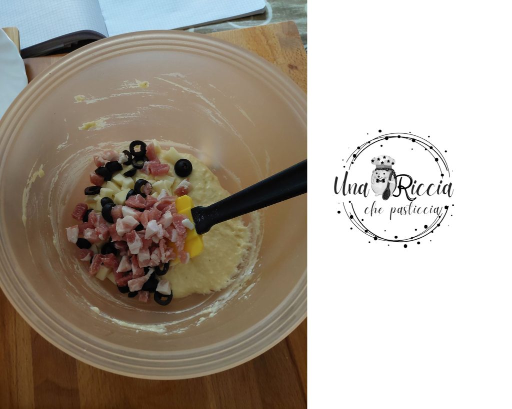 • We gieten het spek, de kaas en de olijven die eerder zijn gesneden in het deeg dat we tot nu toe hebben gemaakt en mengen, we voegen een halve theelepel zout en een snufje peper toe en mengen alles snel.
