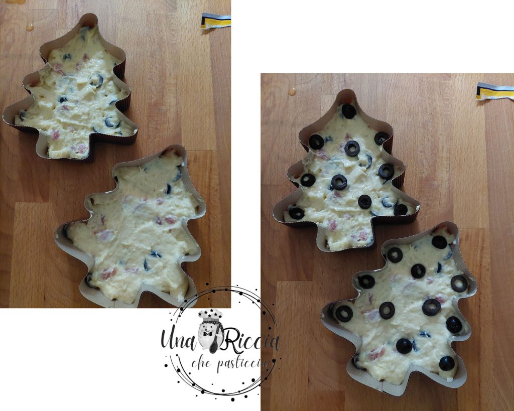 • We gieten het deeg in de papieren vormen met behulp van een lepel of een spatel om ervoor te zorgen dat alle delen van het boompje worden bedekt en decoreren met de achtergehouden plakjes zwarte olijven, daarna bakken we in een voorverwarmde oven op een temperatuur van 170 graden gedurende 30 of 35 minuten.