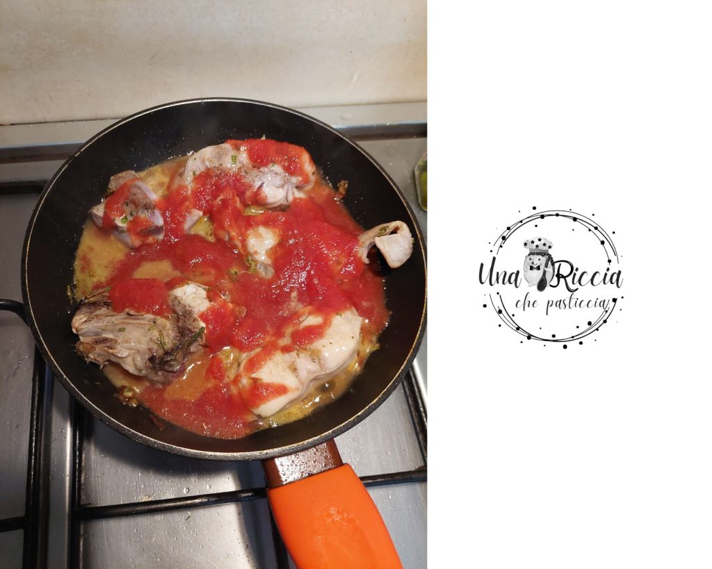 Laat het even bakken en voeg de stukken konijn toe zodat ze aan alle kanten goudbruin worden zonder de kruiden te verbranden. Na een paar minuten, wanneer het vlees goudbruin is, voeg de witte wijn toe en laat alle alcohol verdampen.