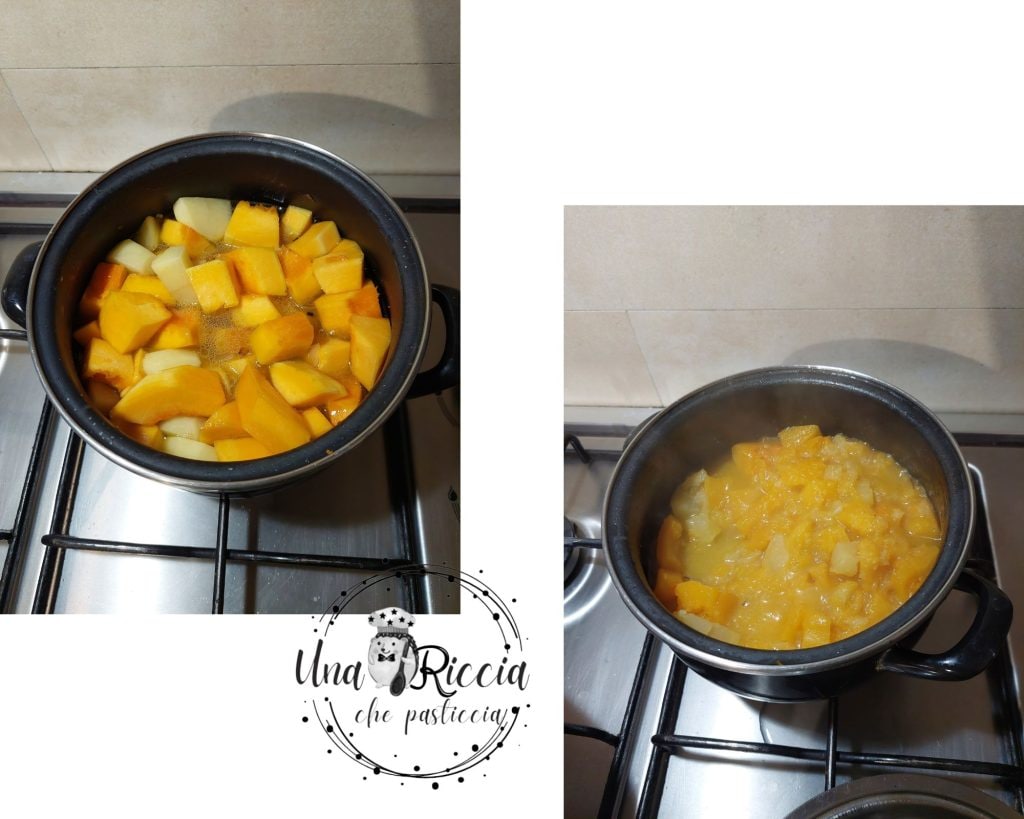 Verhoog dan lichtjes de vlam en voeg het water of de bouillon toe en voltooi het koken van de pompoen, zorg ervoor dat deze niet te droog wordt.