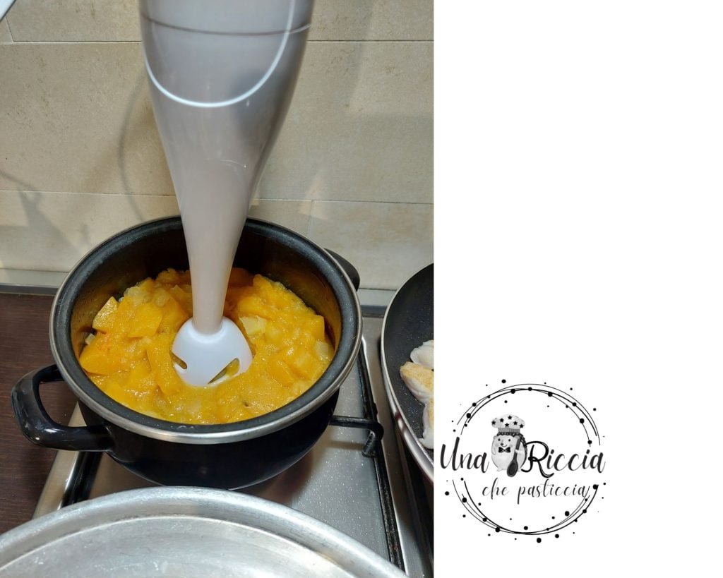 Wanneer de pompoen en aardappelen gaar zijn en uit elkaar vallen als je ze aanraakt, kunnen we ze pureren met een staafmixer, als het nodig is, kunnen we een beetje water of bouillon toevoegen.