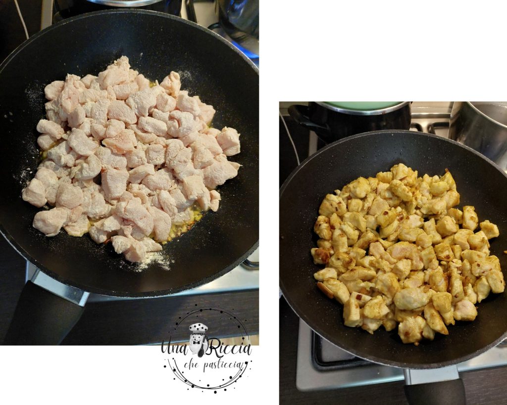• Doe in een antiaanbakpan de olijfolie, fijngesneden ui en het takje rozemarijn en laat het lichtjes fruiten zonder de ui te kleuren. Intussen doen we ongeveer drie eetlepels bloem bij de kip en mengen we om elk stukje vlees te bedekken. Wanneer de ui klaar is, verwijderen we de rozemarijn en voegen we de kerrie toe, mengen en laten we het lichtjes roosteren, daarna voegen we een half pollepel water toe en gaan we verder.