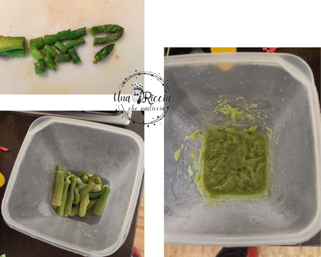 We nemen de asperges en leggen ze op een snijplank, snijden de punten af en leggen deze apart, dan snijden we het zachte deel van de asperge in stukjes totdat je het harde, vezelige deel bereikt. We plaatsen deze laatste delen in een container, voegen een halve soeplepel van het kookwater toe, een snufje zout en een snufje peper en pureren ze met een staafmixer tot een crème.