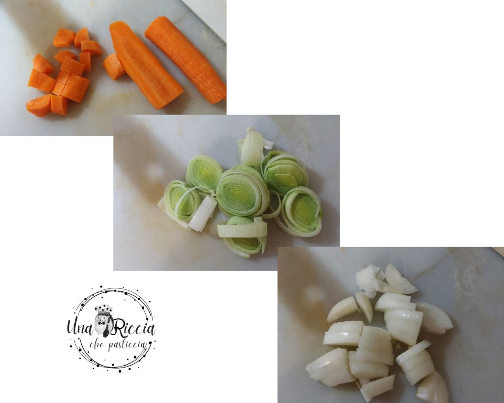 In dezelfde pan waarin we het vlees hebben gebruind, gieten we de resterende olie en voegen we de wortel, ui en prei toe, dan laten we ze bakken met een beetje zout. We roosteren het goed, daarna voegen we het rijstmeel en een lepel heet water toe, laten het een minuut indikken en zetten dan het vuur uit.