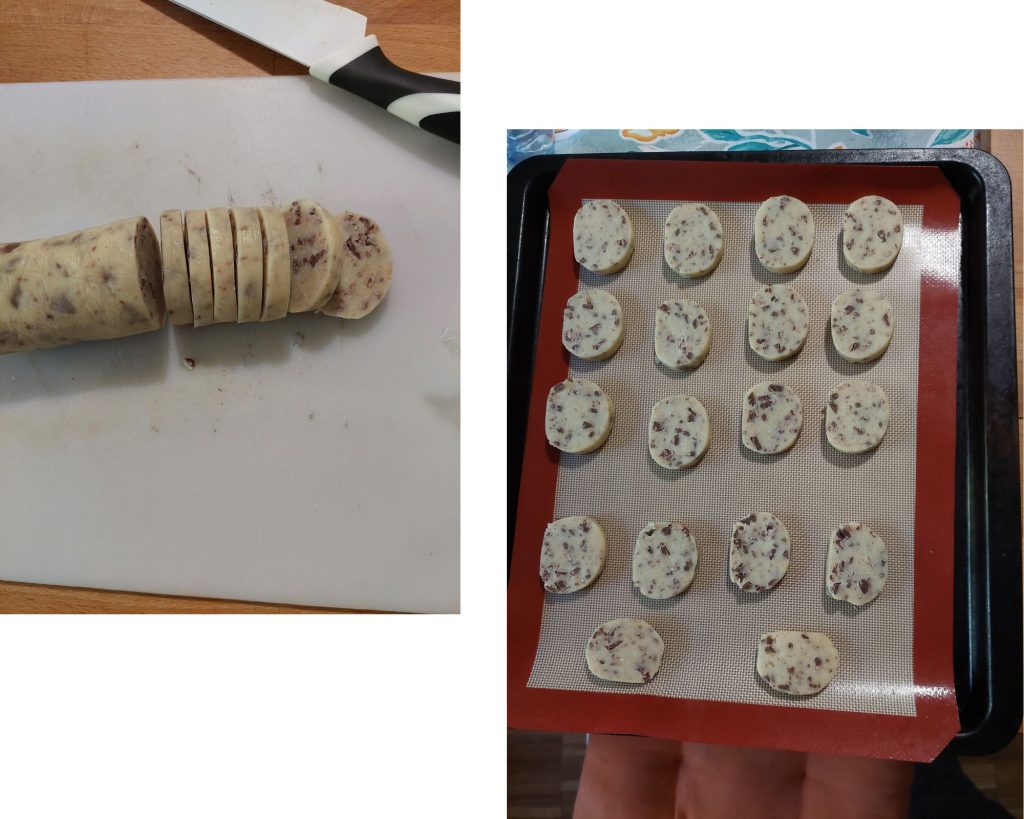 Nu het deeg bevroren is, haal het eruit, verwijder de folie en snijd het in plakjes van ongeveer een halve centimeter, leg ze vervolgens op een bakplaat met een bakmat of bakpapier, met een kleine afstand ertussen.