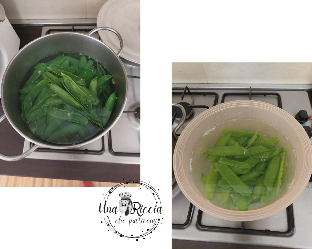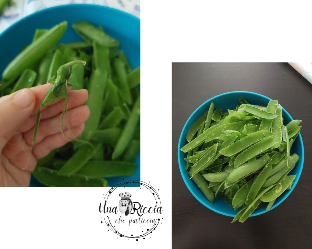 • Dop de erwten, neem de schillen en verwijder de stelen, door eraan te trekken komt ook het zijflament los, maar dat maakt niet uit want we zullen ze door de groentemolen halen. Was ze goed.