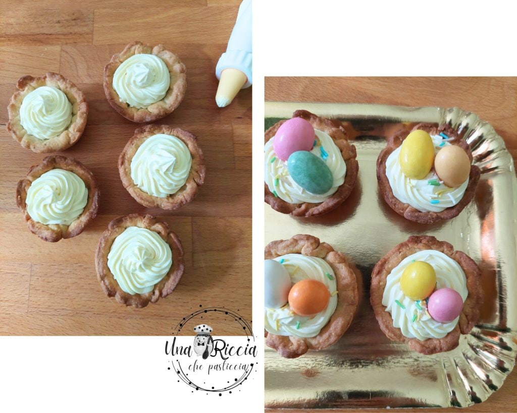 We nemen de verkregen schijfjes en bekleden de muffinvormen, waarbij we de rand onregelmatig laten om het ‘gekreukelde’ effect van het nest te creëren. We prikken de bodem lichtjes, zetten de muffinvorm in de koelkast en verwarmen de oven voor op 175 graden, wanneer het op temperatuur is, bakken we gedurende 20 minuten en totdat ze ook aan de onderkant goudbruin zijn. We halen ze uit de oven en laten ze afkoelen.