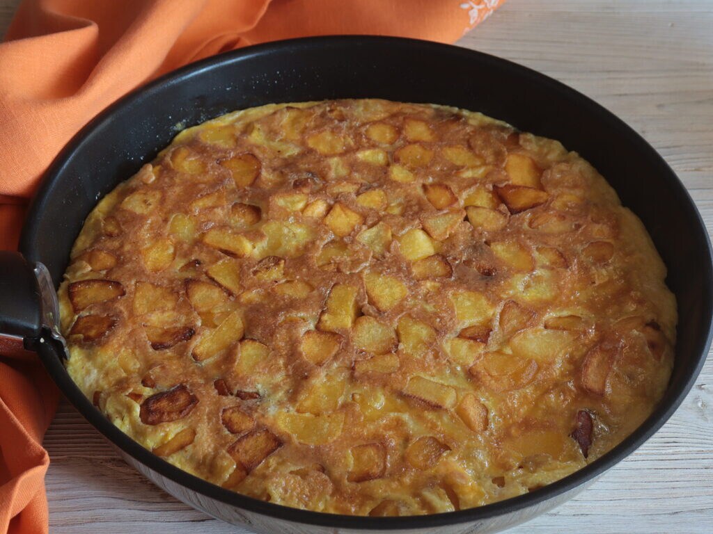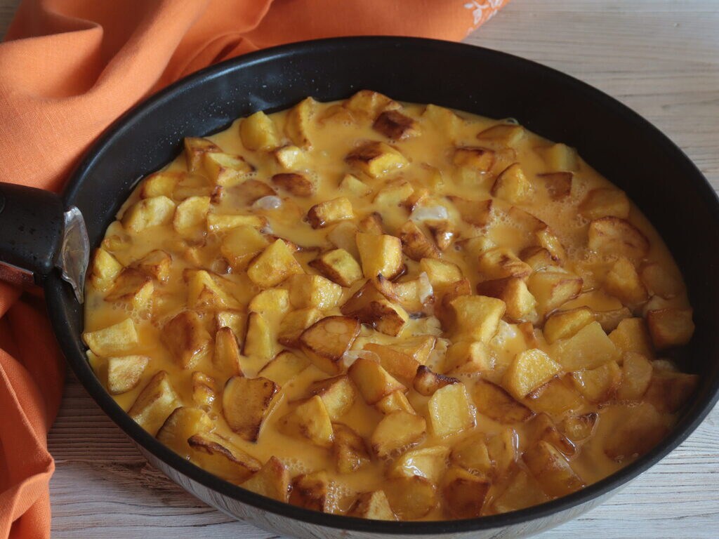 Aardappelfrittata eenvoudig zonder iets toe te voegen, geen peper, geen kruiden maar alleen eieren en aardappelen in hun eenvoud en smaak. Een van de groenten die altijd gekookt worden gegeten, zijn zeker aardappelen, de meest veelzijdige van alle groenten. Laten we nadenken over de kracht die aardappelen kunnen hebben als ze bestand zijn tegen kokend water, de olie van de frituur en bedenk de hitte wanneer we ze in de oven bakken op 200 graden en meer. Er zijn veel variëteiten aardappelen, met gele of witte pulp, met roze of witte schil, de oudere zijn meer bloemig en meer geschikt voor bereidingen zoals puree, ovenschotels of simpelweg gnocchi. De gele, omdat ze resistenter zijn, worden gebakken of als chips gebruikt, natuurlijk zijn ze het hele jaar door verkrijgbaar en worden ze geoogst afhankelijk van kwaliteit en seizoen. Het begint in Sicilië in de provincie Siracusa in april met nieuwe aardappelen, in Apulië in mei en in juni worden ze in Campania geoogst. In Lazio evenals in Emilia en Veneto maar ook andere regio’s van Noord-Italië worden ze geoogst vanaf juli. In augustus en september verschuift de oogst naar de bergen van Trentino, Calabrië en Abruzzo. Het mooie is dat men tijdens de kerstvakantie weer aardappelen oogst in Sicilië die in augustus zijn gezaaid. Gelukkig maakt de huidige aardappel, rijk aan zetmeel en met slechts 85 kcal per 100 gram, niet dik zoals men vroeger dacht, integendeel, ze hebben een lager caloriegehalte dan andere groenten, bevatten geen cholesterol en zijn gemakkelijk verteerbaar.