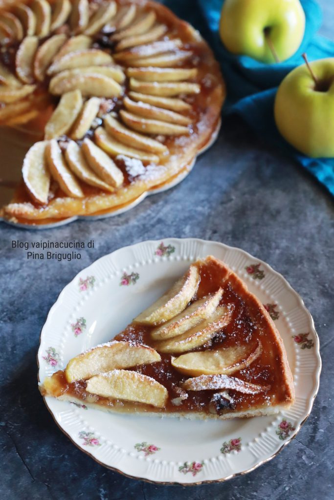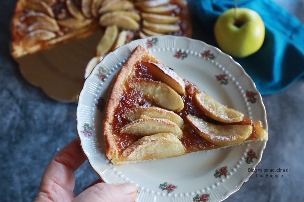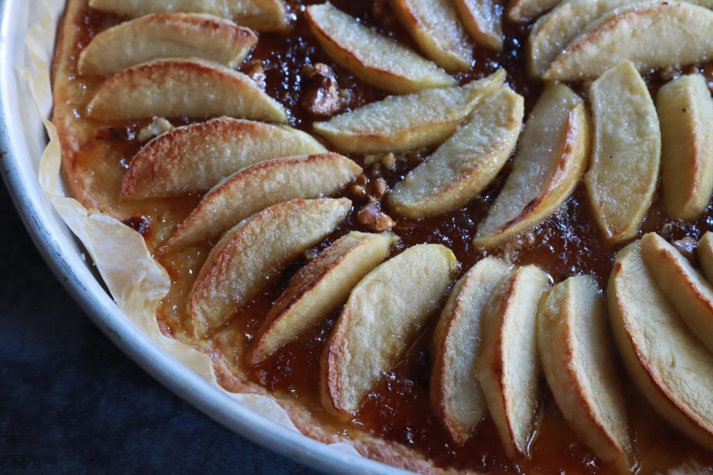 Appeltaart met noten en veel zelfgemaakte citroenjam, door mij thuis gemaakt. Onderaan dit fragment laat ik je de link om het recept voor citroenjam te vinden, ideaal niet alleen om het op brood te eten bij het ontbijt, maar vooral om taarten zoals deze te maken. Het zoete van het deeg, ik heb de veganistische gebruikt, past goed bij de zure smaak van de citroen, meer bepaald van de citroenjam. Je vindt ook hoe je Golden appels kunt koken in een airfryer met weinig suiker en kaneel.