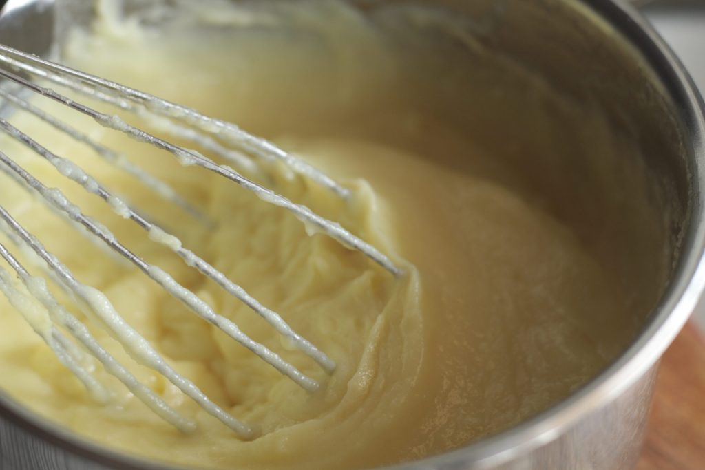 • Mix in een kom de eidooiers met de suiker en klop het mengsel met een garde. Voeg de gezeefde bloem toe en giet langzaam de melk erbij die je al hebt verwarmd met de citroenschil. Zet het pannetje op het vuur en blijf continu roeren tot de banketbakkersroom dik is geworden, 7 minuten zijn voldoende. (afbeelding 1)