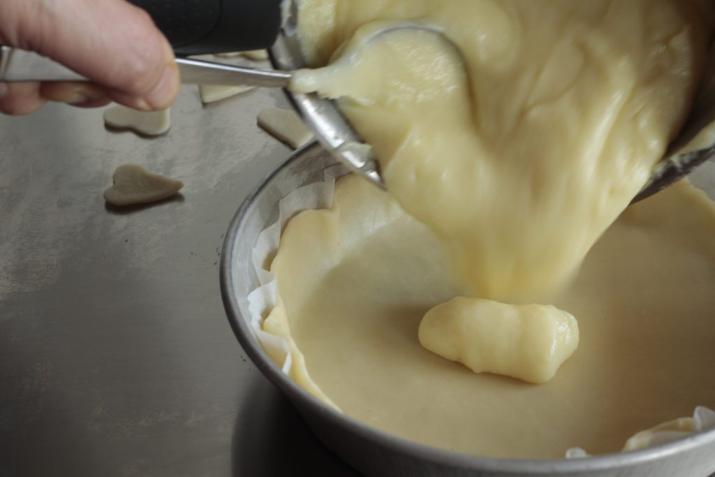• Giet de banketbakkersroom in het midden van het bladerdeeg en vouw de randjes naar het midden, voltooi door de Arlecchino taart te versieren met de eerder uitgesneden hartjes.